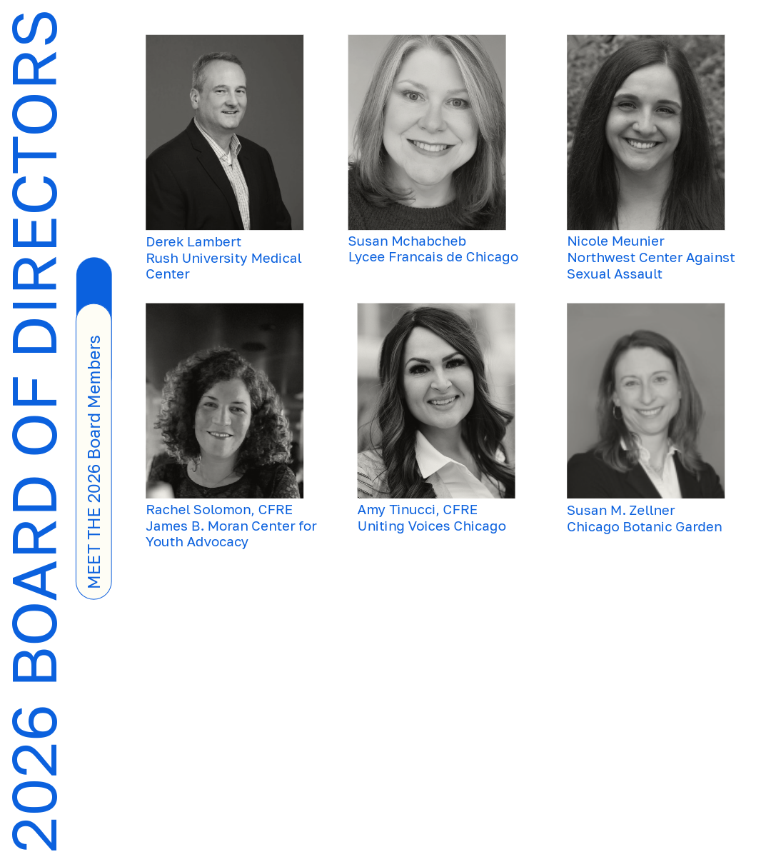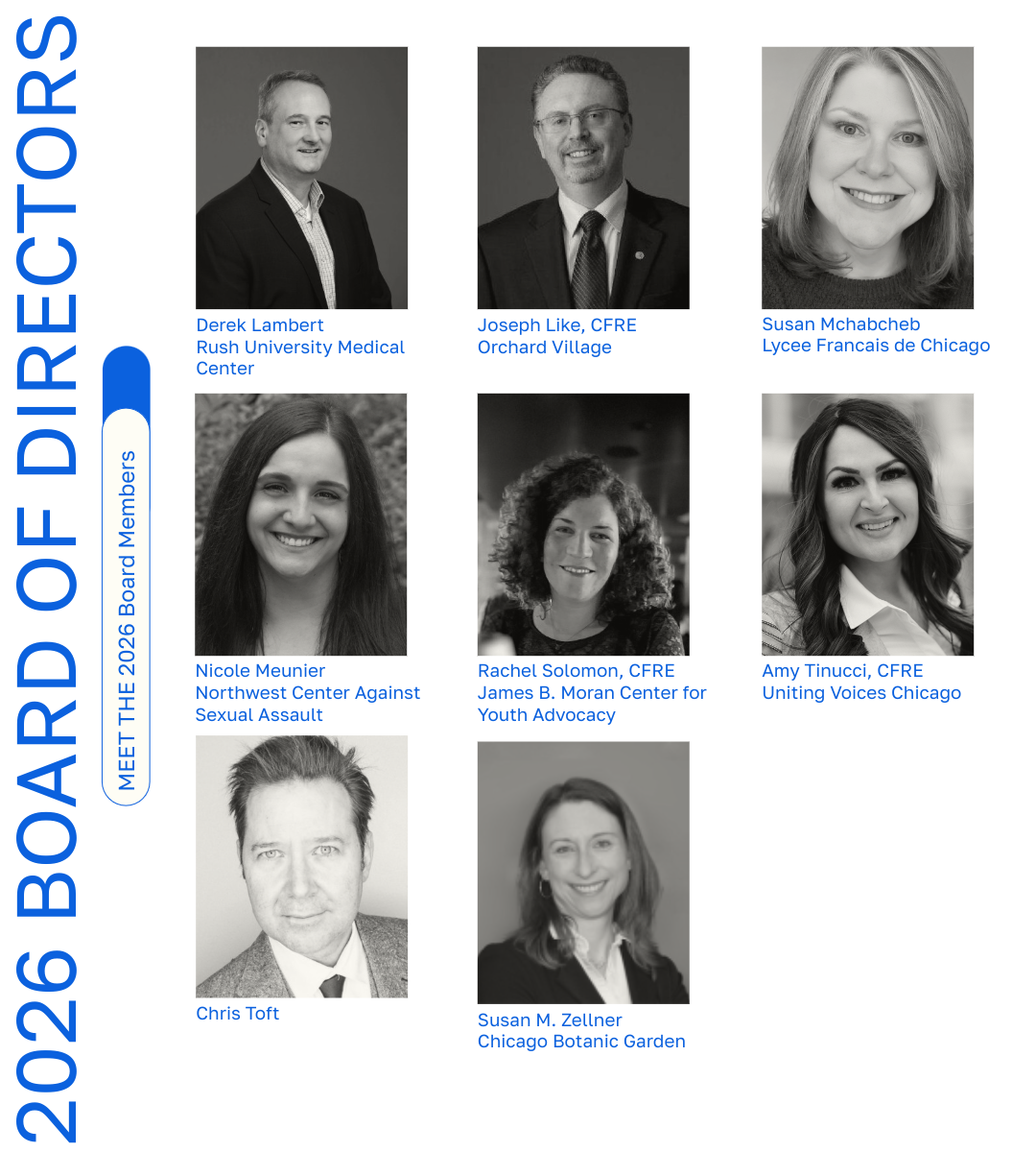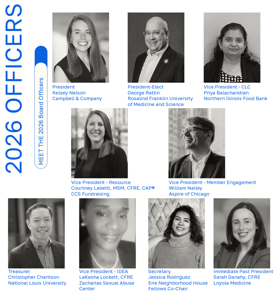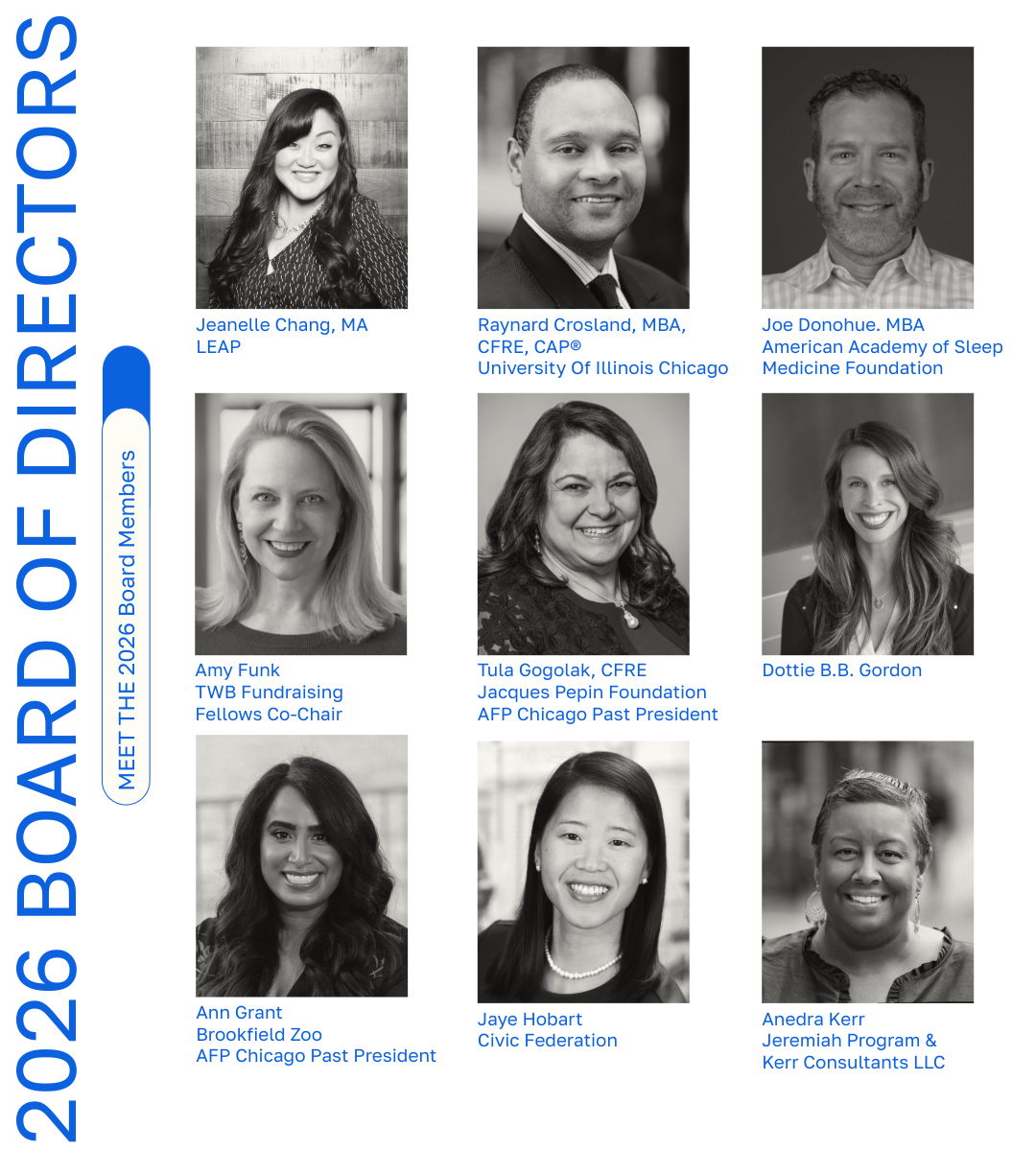 Board of DirectorsThe AFP Chicago Chapter Board of Directors is an all-volunteer board that is made up of 26 members. Their role is to ensure the policies and procedures established by the chapter are fulfilled. Please click here for more information regarding board service and AFP Chicago Pathways to Leadership. Board Resources Page |